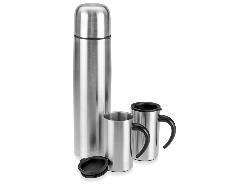 Удобный туристический набор из термоса, который поможет сохранить ваши напитки теплыми более 6 часов и двух кружек с термоизоляцией станет отличным подарком для любителей активного отдыха. Чехол с ручкой удобен для переноски. Объем термоса – 1 литр, объем кружек – 300 мл. Возможно нанесение на металлические поверхности оригинальной гравировки.