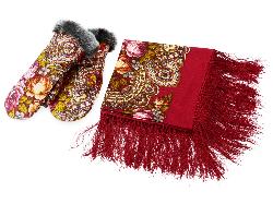 Великолепный подарок для женщин, ценящих русскую культуру. Набор состоит из настоящего Павлопосадского шерстяного платка и рукавиц с отделкой из искусственного меха. Аксессуары украшены роскошным орнаментом.