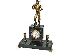 Настольный прибор из керамогранита выполненного под малахит. Фигура изготовлена из высококачественной стали и покрыта золотистым напылением. Набор «Шахтер» станет оригинальным бизнес подарком для руководителя, а нанесенная персонализация будет напоминать об успешном партнерстве. Оригинальный настольный прибор с часами станет украшением рабочего места.
