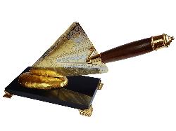 Оригинальный статусный подарок в виде строительного мастерка. Станет приятным подарком для руководителя строительной компании или презентом на новоселье. Подставка статуэтки выполнена из долерита - удивительно прочного и стильного материала. Сам мастерок изготовлен из латуни с золотым и никелированным покрытием. Настольный прибор упакован в коробку из дерева со стильным матовым покрытием.