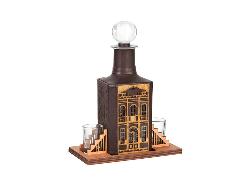 Графин декоративный «Усадьба» - это эксклюзивный подарок для руководителя или ценного сотрудника. Графин и две стопки изготовлены из высококачественного стекла. Внешняя отделка выполнена из натуральной кожи, а подставка сделана из натурального дерева в форме старинного замка. Декоративная гравировка добавляет подарку изысканности и элегантности!