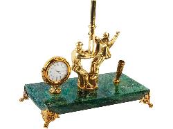 Отличный презент для руководителей и деловых партнеров в нефтедобывающей сфере. Настольный прибор, выполненный из натурального змеевика и бронзы, украшен фигурами рабочих, добывающих нефть. На приборе предусмотрены часы и держатель для ручки.