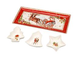 Набор: три тарелочки для закусок и десертов на общем подносе. Оригинальный и полезный подарок для того, кто по-настоящему дорог. Набор изготовлен из фарфора, что добавляет ему легкости и изящества. Набор упакован в яркую подарочную коробку.
