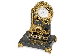 Эксклюзивный подарок для представителей транспортных, железнодорожных и туристических компаний. Настольный прибор с часами на подставке украшен изображением самого первого паровоза. Набор обладает классическим сочетанием темно-зеленого и золотистого оттенков.