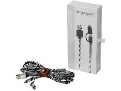 Кабель для зарядки Paramount 3-в-1 в тканевой оплетке. Кабель для зарядки Paramount 3-в-1 в тканевой оплетке оснащен разъемом USB типа С и двойным разъемом 2-в-1, подходящим как для устройств с Apple iOS, так и с Android. Длина кабеля — 280 см; в комплекте предусмотрен полиуретановый ремешок для складывания кабеля. Обеспечивает зарядку током 2 А и передачу данных. Упакована в премиальную подарочную коробку. Ткань.