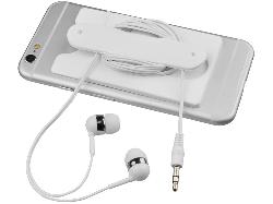 Проводные наушники и силиконовый бумажник для телефона. Мягкий силиконовый бумажник для телефона с подставкой с клейкой полоской для удобного крепления к задней поверхности телефона вмещает 2-3 кредитных карты и/или удостоверения личности. Его также можно использовать в качестве подставки для телефона или для хранения наушников. Включает проводные наушники. Силикон.