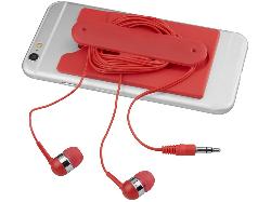 Проводные наушники и силиконовый бумажник для телефона. Мягкий силиконовый бумажник для телефона с подставкой с клейкой полоской для удобного крепления к задней поверхности телефона вмещает 2-3 кредитных карты и/или удостоверения личности. Его также можно использовать в качестве подставки для телефона или для хранения наушников. Включает проводные наушники. Силикон.