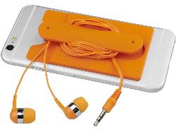 Проводные наушники и силиконовый бумажник для телефона. Мягкий силиконовый бумажник для телефона с подставкой с клейкой полоской для удобного крепления к задней поверхности телефона вмещает 2-3 кредитных карты и/или удостоверения личности. Его также можно использовать в качестве подставки для телефона или для хранения наушников. Включает проводные наушники. Силикон.