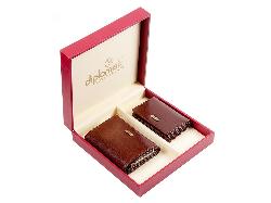 Подарочный набор из компактного портмоне для хранения купюр, монет и пластиковых карт, а также небольшой визитницы. Все аксессуары выполнены из натуральной кожи коричневого оттенка.