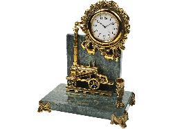 Эксклюзивный подарок для представителей транспортных, железнодорожных и туристических компаний. Настольный прибор с часами на подставке украшен изображением самого первого паровоза. Набор обладает классическим сочетанием темно-зеленого и золотистого оттенков.