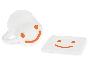 Белоснежная чайная пара - вовсе не скучный подарок, как может показаться на первый взгляд. На дне кружки с внешней стороны и на блюдце-подставке находится веселый смайлик. Когда вы пьете кофе, ваша кружка "улыбается" соседу. Вместительную подставку можно использовать под десерт. Объем кружки 200 мл.