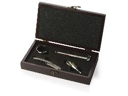 Набор аксессуаров для вина в стильном деревянном футляре. Придется по вкусу любителям стиля винтаж. В наборе воротничок на бутылку, воронка-аэратор, штопор-открывалка, термометр. На деревянную коробку можно нанести шильд или изображение.