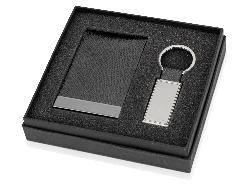 Визитница из кожзаменителя и металлический брелок прямоугольной формы - идеальный тандем из бизнес-атрибутов, которые всегда дополнят образ делового человека и принесут ему пользу. Набор можно персонализировать методом гравировки.