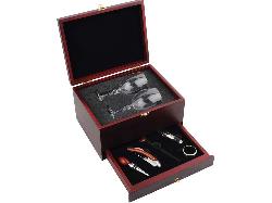 Эксклюзивный подарок для делового партнера: набор аксессуаров для вина в деревянной шкатулке. В комплект входят 2 бокала, пробка для бутылки, термометр, воротничок, штопор-открывалка, воротка-аэратор. На шкатулку можно нанести шильд с именем владельца.