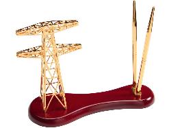 Настольный прибор включает в себя две ручки золотистого цвета на подставке и фигурку высоковольтного столба ЛЭП. Прибор послужит тематическим подарком для руководителя или сотрудника энергетических компаний. Прибор может быть персонализирован при помощи шильда или гравировки.
