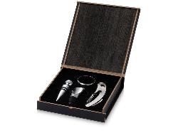 Оригинальный подарок к любому празднику. Подарочный набор аксессуаров для вина в деревянной коробке порадует истинного ценителя. В наборе штопор , пробка, кольцо для бутылки и воронка-аэратор. На деревянную коробку можно нанести изображение по вашему эскизу.