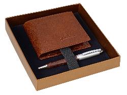 Отличный подарочный набор для мужчин включает в себя портмоне из натуральной кожи и шариковую ручку в металлическом корпусе, задекорированную кожей. Составляющие набора выполнены в сочетающейся цветовой гамме.