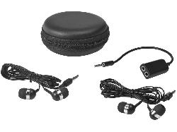 Наушники Sound off и сплиттер с чехлом. Отличный аксессуар для путешествий! Набор включает два комплекта наушников, музыкальный сплиттер и чехол из ЭВА. Позволяет двум людям одновременно слушать музыку с одного аудиоустройства. Подходят для использования со смартфонами, планшетами и всеми музыкальными плеерами с 3,5 мм аудиоразъемом. Длина провода: 110 см. АБС-пластик и чехол из ЭВА.